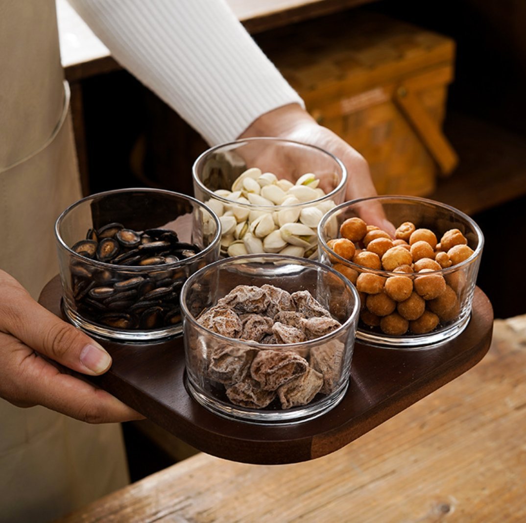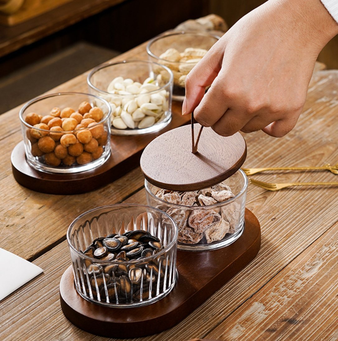 Each bowl sits securely in the smooth wooden base, keeping your table neat and organized while adding a touch of sophistication to your presentation. Ideal for everyday use or festive occasions, it’s a must-have for anyone who loves hosting in style.