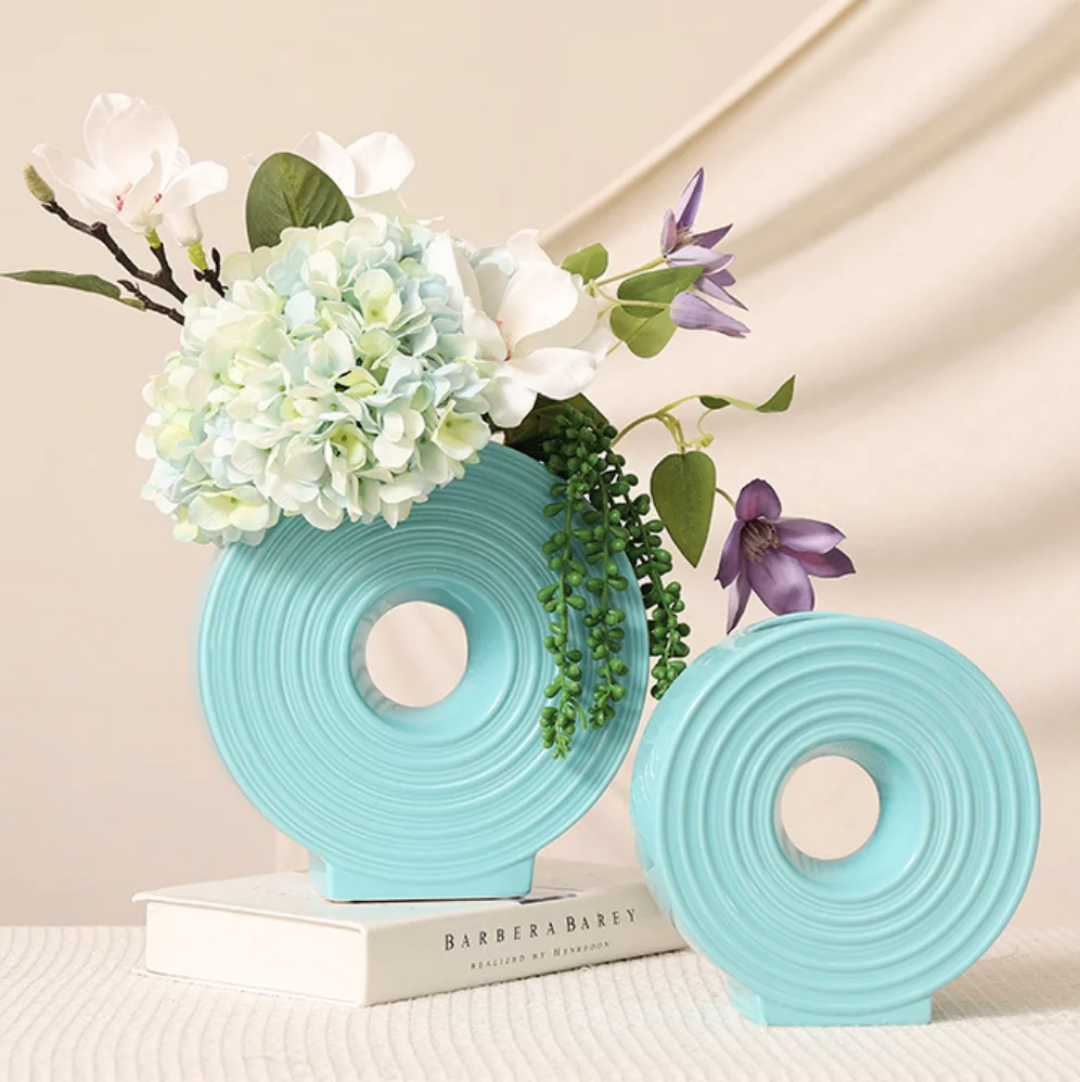 The flat round ceramic vase boasts a modern minimalist design, making it a versatile accent piece for various interiors. Whether placed as a table centerpiece or a shelf ornament, it instantly elevates the space with sophistication and charm.