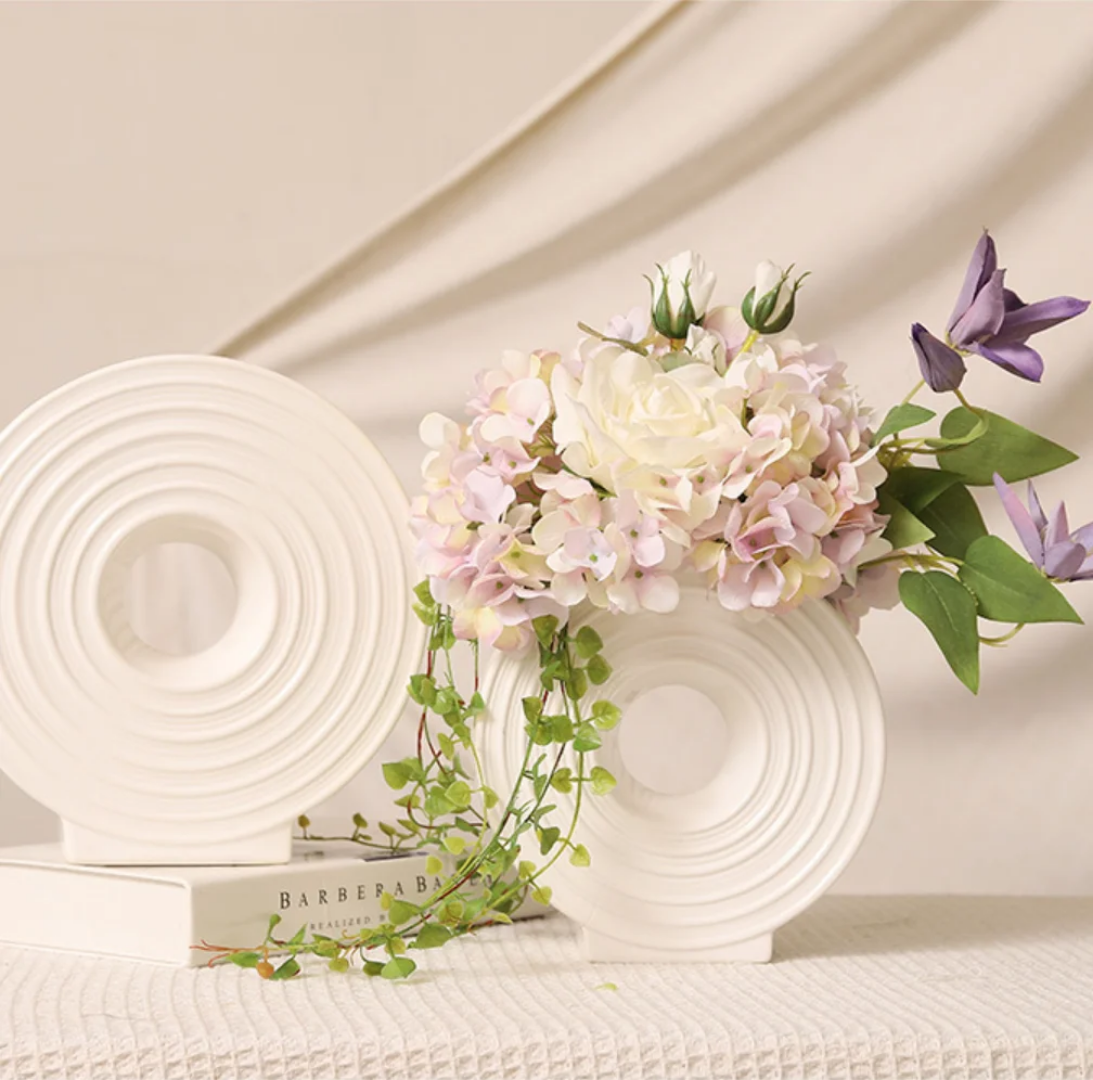 Creative Flat Round Ceramic Vase with Artificial Flower Set – Elegant Silk Floral Decoration