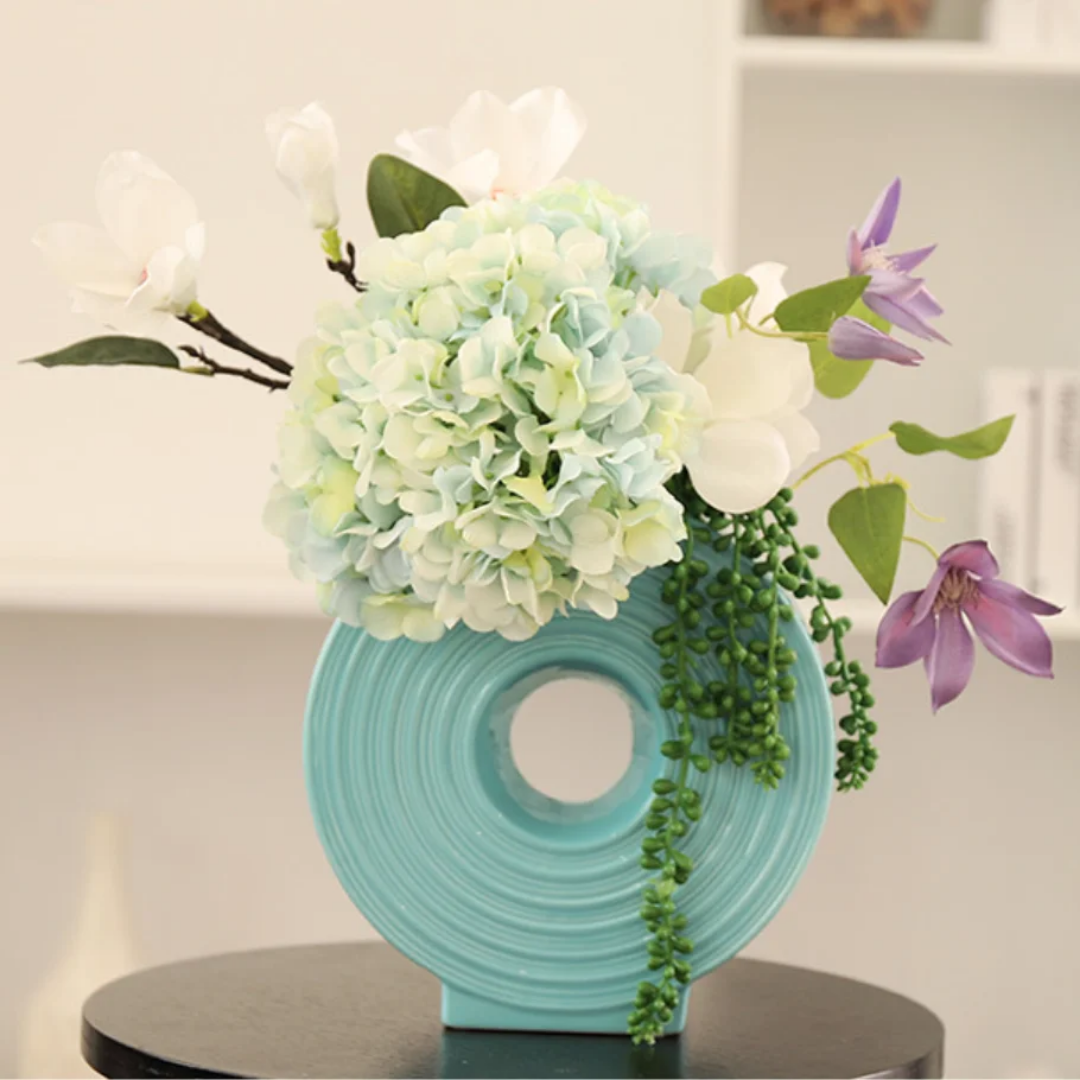 Transform any room with the Creative Flat Round Ceramic Vase, beautifully paired with a lifelike silk flower arrangement. This decorative set features realistic hydrangea, magnolia, and rose flowers, adding a touch of timeless elegance to your living room, dining table, office, or entryway.